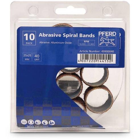 PFERD Spiral Bands are suitable for general grinding applications on metal and other materials. With a special manufacturing process, these Spiral Bands also provide particularly high stock removal increasing user productivity. When used with the applicable PFERD Rubber Drum Spiral Holders, these Spiral Bands provide outstanding life in even the most demanding applications. They are available in a range of grits to suit various applications.Specifications Band Diameter: 25 mm (1″) Band Width: 25 mm (1″) Abrasive Grit: 40G Abrasive Type: Aluminium Oxide Optimal Operating RPM: 16,000 – 22,900 Safety Information Maximum RPM: 22,900 (30 m/s) Complies with the following standards: oSa Accredited Recommended Personal Protective Equipment (PPE): Safety Glasses Safety Gloves Hearing Protection Respiratory Protection For use with PFERD Spiral Band Rubber Drum Holders 49900049 – 25 x 25 mm with 6 mm Shank Includes 10 x Spiral Bands